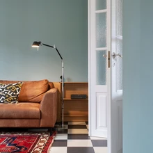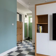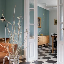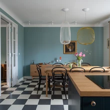 «Kokkuvõttes tegime ruumi paremaks ja ajastutruumaks, kui see oli enne remonti,» viitab Liis Tarbe näiteks peegellagedele, musta-valgekirjule Marmoleumi klikitavale põrandale ning elutoa kõrgetele kahepoolsetele ustele. «Uksi pole siin õigupoolest kunagi olnud, kuid see tundus sobiv täiendus, samuti on lino-leum ajastule iseloomulik materjal.» Tume köök ja tumedad detailid jätkavad loogiliselt terviklikku kujunduslaadi.