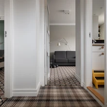 Teisele korrusele viivat treppi katavad lapsepõlvenostalgilist flanellsärki meenutavad ruudulised vaipkatted; mustrilised Ege vaipkatted valiti ka teise korruse kabinetti ja magamistuppa, kuhu Liis kavandas veel sumedat rohelist tooni tahveldusega seinakapid.
