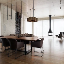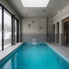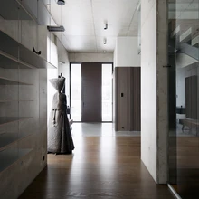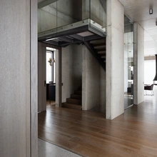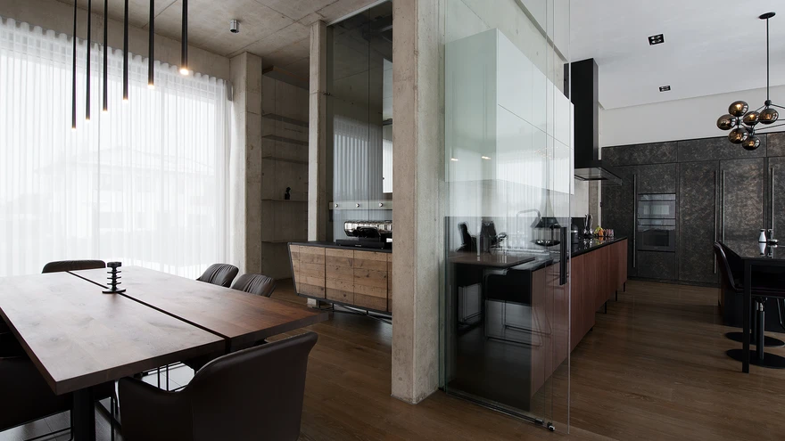 Üksikute skulpturaalsete mööbliesemete ja robustsete betoonseintega interjööris ei teki kordagi külma või steriilset tunnet. Hallikasroheka tonaalsusega betoon koos tumepruuni puidu ja pronksikarva detailidega mõjub hoopis üllatavalt hubaselt ning soojalt. Avatusele ja läbipaistvusele rõhuvas interjööris on ka mitmeid omaette olemise kohti – intiimsema olemisega magamistoad, suurte raamaturiiulitega soliidne kabinet teisel korrusel või mugavate tugitoolidega istumisnurgad.