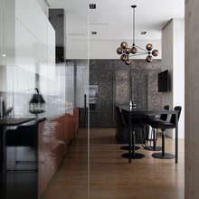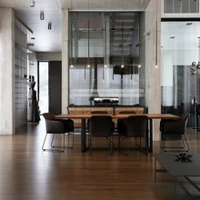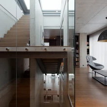 Ülikõrgete lagedega ruumikas elutoas on luksuslikult õhku, avarust ja avatust. Suured põrandani aknapinnad ja klaasseinad lasevad valguse liikuma ja pakuvad vaateid nii majast välja kui ka läbi erinevate ruumide. Mööda läbi maja kõrguvat klaasšahtiga treppi liikudes avanevad ootamatud vaatenurgad, peegeldused ja interjööri kaunid arhitektuursed rakursid.