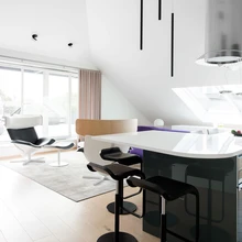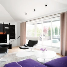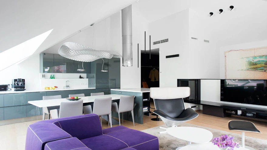 Julgeid värve ja kontraste on esinduslikus elutoas omajagu, ühtlaselt valgete seinte ja rahulike põrandate taustal mõjuvad ühteaegu stiilselt nii violetne B&B Italia diivan Bend (salong Inspira) kui ka efektne kõrgläikeline köögimööbel. Esimese korruse kujundus on väljapeetum, mis on privaatsemate ruumide – magamistubade ja kabineti iseloomu arvestades igati õigustatud.