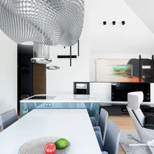 Omamoodi väljakutse oli ebastandardsesse ruumi valguslahenduse leidmine. Süvistatud valgusteid polnud kaldlagedel võimalik kasutada ning seetõttu valgutavad ruumi tagasihoidlikud pinnapealsed keeratavad kohtvalgustid ning kaks efektset pilgupüüdjat: söögilaua kohal Artemide valgusti Cosmic Angel ning köögisaare kohal Davide Groppi valgustid Miss (mõlemad salongist Laterna Magica). Päevavalgus tulvab ruumi kõrgete klaasuste kaudu, mis avanevad terrassile, ning katuseakendestki paistab tuppa eri valgust.