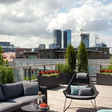 Vannitubades on kasutatud monokroomset suuremõõdulist seinaplaati, mis annab ruumidele rahuliku ja puhta ilme. Korteri üks olulisi lisaväärtusi on kahtlemata avarad päikese poole avanevad terrassid. Väiksem terrass kulgeb ümber esimesel korrusel asuva peamagamistoa ja kabineti ning suur terrass jääb elutoa kõrvale - uhke väliruum on sisustatud Taani tootja Cane-line õuemööbliga ning haljastus planeeriti koostöös Rehepapp Aiakujundusega. Suure korteri puhul on valgus, vaated ja ilmakaared sama tähtsad kui eramaja kavandades. Selles kodus on kõik suurepäraselt paigas – hea asukoht, hästi toimiv ruumiplaan ning ajatu, kuid samas mõnusaid kihistusi pakkuv sisekujundus, millele elanikud saavad lisada oma isikliku mõõtme.