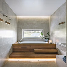 Puhtast, puutumata loodusest ümbritsetud maja sisekujunduslikud märksõnad pakkus väliskeskkond ise välja – naturaalsus ja soojad loodustoonid. Materjalidena on interjööris kasutatud puitu, kivi ja looduskiviimitatsiooniga keraamilisi plaate.