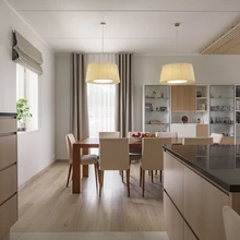 Kuna eelmisest kodust oli pererahvale armsaks saanud pikalt nende ühiseid emotsioone talletanud kirsipuust söögilaud, otsustati see ka uude koju kaasa võtta. Interjööri värvigamma saigi alguse just laua kirsitoonist, mille kõrvale hakkas sisekujundaja sobitama loodustoone, nii harmoneeruvaid kui ka vastanduvaid värve, nagu näiteks türkiis.