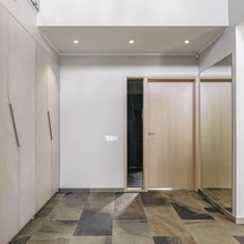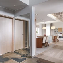 Sisekujundaja Viktoria usub, et lihtsuses peitub võlu, seetõttu on ka selles kodus kõik hästi lihtne ja lakooniline. Siiski jätkub huvitavaid detaile ja põnevaid lahendusi, mis kodu isikupäraseks muudavad, kõikjale. Majja sisenedes ja väikest eeskoda läbides satub avarasse trepihalli, kus püüavad pilku efektse lõikega garderoobiuksed. Ebatraditsioonilised laeni ulatuvad siseuksed mõjuvad rahulikult ja tavapäraste ustega võrreldes tekitavad seinapinnale vähem liigendatust. Elutoaala tsoneerib lakke paigaldatud puitsõrestik. See mõjuv konstruktsioon tekitab hubasust ja lisab suurele heledale ruumile paraja annuse dünaamikat.