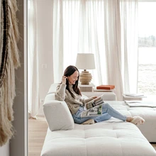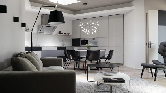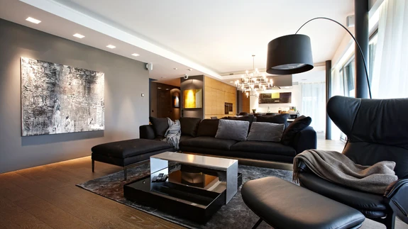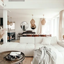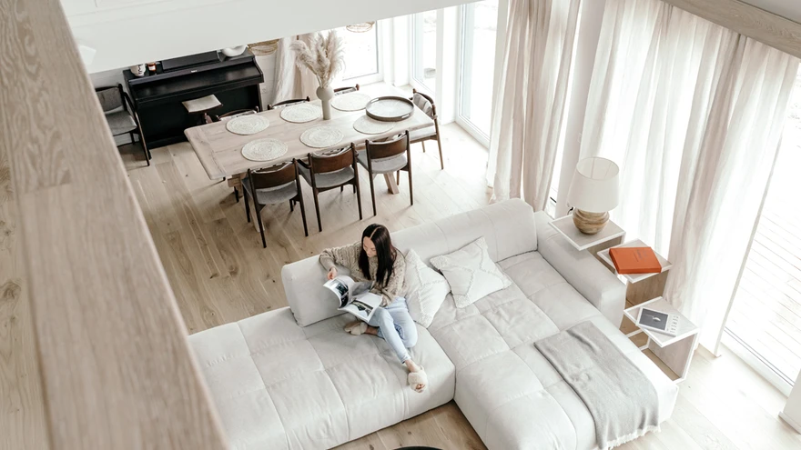 Interjöör, mille lahutamatuks osaks on avarad vaated, tuli õhuline, helge ja valge. Pilk saab vabalt rännata kõrges avatud ruumis ja ka läbi suurte klaaspindade majast välja, loodusesse. Valges elutoas valitseb harmoonia ja rahu, valitud materjalidki – naturaalne puit, kivi, tekstiilid − on kooskõlas ümbritsevaga.