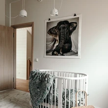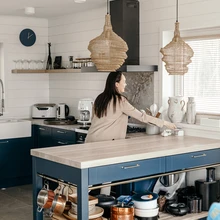 Pika söögilaua kohal rippuvad kuldsed valgustid leiti Mustri poest juba enne, kui maja kerkima hakkas, ning lampide viimistlusest inspireerituna pikiti kuldseid detaile hiljem mujalegi interjööri. Põhjamaist helgust vürtsitavad aafrikapärased esemed, paljud põnevad meened pärinevad ja tuletavad meelde pere hiljutist reisi Lõuna-Aafrika Vabariiki. Köögiga on toodud sisse sinine värvinüanss ja kontrasti pakub tume puit.