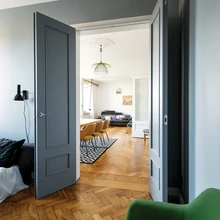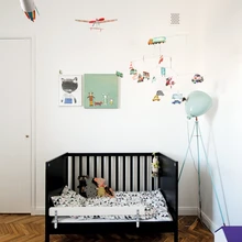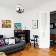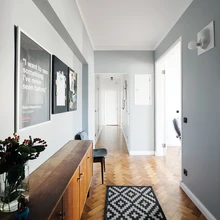 Korteri värvigamma põhineb lihtsuse ja funktsionaalsuse põhimõttel – seinad ja lagi värviti valgeks, magamistuba ja koridori seinad halliks – et oleks lihtne üle värvida, kui pere pisim liige on omi täiendusi teinud. Monokroomne taust on rahulik kest eri ajastust pärit mööblile, tekstiilidele ja kunstile, mida leidub selles kodus väga palju. Suur osa mööblist pärineb Mari-Liisi ja Martini varasematest kodudest. Esemeid on elu jooksul kogunenud omajagu ja nii mõnelgi on oma põnev lugu. Söögilauatoolid on pärit näiteks Mari-Liisi eelmise töökoha, disainibüroo Velvet vanast kontorist ja lastetoa pesakastikujuline kapike Skype’i eelmisest kodust.