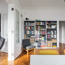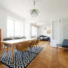 Korter oli uute omanike kätte jõudes väsinud olekus ja vajas turgutust. Eelmine omanik oli selle tubade kaupa välja üürinud ja kõik toad olid seetõttu ka isemoodi remonditud ning põrandad ja seinad paksu värvikihi all. Õnneks polnud aga suuremaid ümberkorraldusi tehtud, nii et põhjalike «väljakaevamiste» käigus tuli värvikihi alt välja imeilus kalasabaparkett koos nurgaliistude ja teise detailidega. Võimalikult palju algupäraseid detaile ja esemeid päästeti ning restaureeriti – uksed, laekarniisid ja -rosetid, messingist kardinapuu ning isegi mõni ukse käepide, mis oli originaalina säilinud. Saja ruutmeetri suuruse korteri planeering jäeti suures osas muutmata, eraldi köögi ning suure elu- ja söögitoaga kodu just otsitigi. Olles piisavalt palju elanud avatud köögiga korterites, tundus palju süüa tegev ja külalisi võõrustav pere vajadust eraldi köögi järele, et toidutegemise lõhnad tervet elamist ei täidaks.