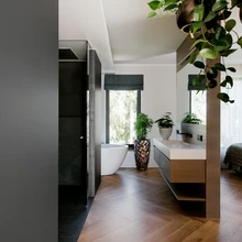 Üllatavalt avarana mõjub avatud magamis- ja vannituba, mille võib mõtteliselt jagada mitmeks alaks: rõivistu, puhke- ja märgruum eraldi vanni ning dušiga. Viimati nimetatute vahel on väike seinaosa, mis varjab voodis lesijale vannitoas toimuva. Seina taga laiub Eesti firma Eumar valamu Carre ja sealsamas kõrval on Balteco vann Flo.