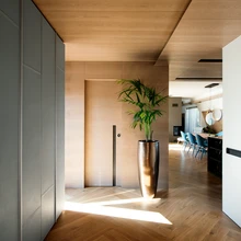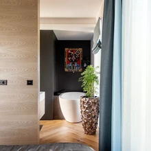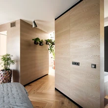 «Ma ei tahtnud seda teekonda kinni panna ja seina äärde pimedat garderoobi teha, pealegi soovis korteri omanik niisugust magamistuba, kus saab mõnusalt ringi liikuda,» täpsustab sisearhitekt. «Uut korteri planeeringut luues sai silmas peetud, et iga liikumistee lõpeb mingi vaatega, olgu selleks siis aken õue, peegel või kunstiteos.»