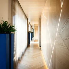 «Seinapaneelijaotus ja leedvalgustite paigutus neis on inspireeritud taimelehe makrovõttest. Viltused rootsud sobituvad hästi katusekorruse viltuste lagedega,» lausub Hannelore Kääramees, kes kasutas sama motiivi ka roosipuust plaadiga toekale söögilauale jalgu disainides.