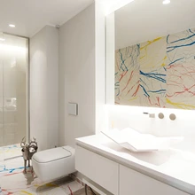 Magamistoa märjema ala seinad on viimistletud halli värvi täismassplaadiga, mille jaotus on samuti ajendatud leherootsu geomeetriast.