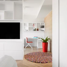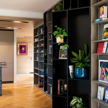 Samuti on ta projekteerinud kogu korteri unikaalmööbli. Näiteks elutuppa, kabinetti ja tütre tuppa vahva jaotusega raamaturiiulid.