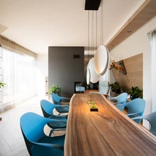 Avatud köögiga elutoa toiduvalmistamise tsoon on minimalistlik, aga kõik hädavajalik on olemas, et kokata ise ja kostitada ka sugulasi-sõpru. Suure söögilaua kohal ripub Vibia valgusti Cosmos. Selles kodus peetakse lugu nii maailmakuulsast kui ka heast Eesti disainist ja kunstist.