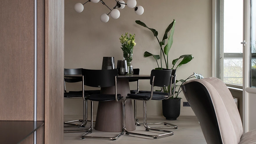Kärt Tähema enda kavandatud söögilaua ümber on Thonet’ klassikalised konsooltoolid (Mark Stam, 1931). Lühter Drop on 101 Copenhagen valikust. | Terje Ugandi