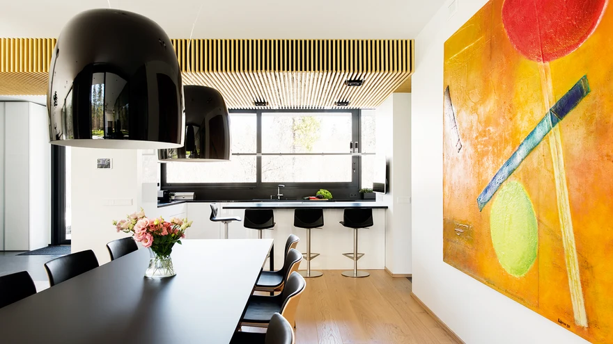 Eramu uhkeim ja mõjusaim ruum on maja keskele jääv suur avar elutuba. Helget ruumi tsoneerib selgevormilise mahuna mustast looduskivist kamin. Kaminatuld saab vaadelda nii diivanitel kui ka pika söögilaua taga istudes. Teine ruumi liigendaja on elegantne Rimadesio vitriinkapp – puhvetist ühele poole jääb õdus diivanitega istumise ala, teisele poole tekib n-ö liikumistee. Viimast markeerib ka piki ruumi laes kulgev puitribistik. «Ribilagi sai tehtud ruumiakustikale mõeldes, teisalt toob see valgete puhaste pindade kõrvale uue materjalinüansi,» märgib Taso Mähar. «Kõik interjööri valitud materjalid on ehedad ja naturaalsed: puit, looduskivi, klaas.»