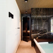 Taotlusest arhitektuuritervikusse sulanduda räägib ka kogu interjööri kavandatud eritellimusmööbel ja detailid. Saunaruumidki on kujundatud lihtsas ja kvaliteetses võtmes. «Me ei armasta mosaiigiga kaaretamist ega kadakast kabenuppe,» märgib Taso. «Asju ei tohi üle disainida ega kõiki mõtteid ühte projekti panna.» Sisearhitektina tuntakse heameelt, kui töö on peale suure-pärase tulemuse kandnud vilja ka harivast aspektist ja klient ütleb, et on protsessi käigus arenenud, targemaks saanud, oskab kaunist keskkonda hinnata ja selles elades end hästi tunda.