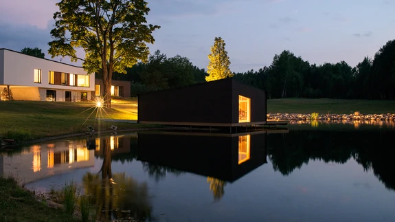 Rannamõisas sirutub kallakust alla omanäoline suurte akende, talveaia ja avarate terrassidega eramu, mille korrused pole päris kohakuti ja saunakompleks asub eraldi, tiigi kaldal. Loodusesse sulandunud hoone projekteeris arhitekt Kaspar Kruuse oma vanematele.