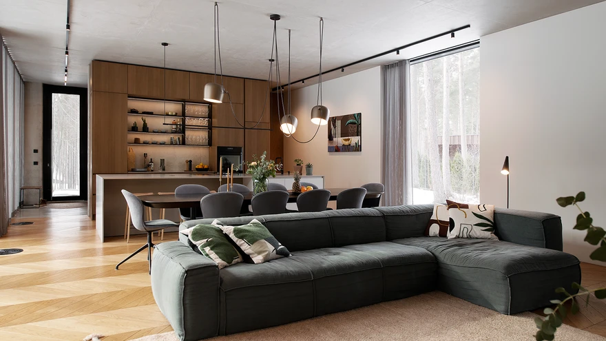 Betooni külmust aitavad pehmendada mugav sohva, tekstiilid ja soojad puidutoonid. Avatud, heledat puitu ja tehiskivi kombineeriv minimalistlik köök telliti Arensist. | Terje Ugandi