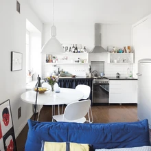 Omaette väljakutse oli mitmefunktsioonilisse kööki-elutuppa leida sobivate mõõtmetega diivan ning pärast pikki otsinguid nii Eesti kui ka vanamööbli hulgast otsustati disainiklassikasse kuuluva Ligne Roset’ sügavsinise Togo kasuks. Kahekohaline diivan sobib oma mõõtmetelt ja seda on väga lihtne toas ringi paigutada. Lisaks saab tulevikus diivanit ka moodulite abil laiendada. Teine elutoa lemmikleid on juba alates 1949. aastast tootmises olnud String Systemi riiul, mida saab ka peaaegu lõpmatuseni edasi arendada.