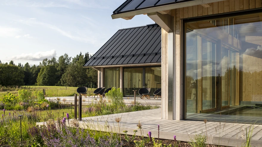 Suuremad klaaspinnad on suunatud õhtupäikese poole, mida nautida maja ümbritseval terrassil. | Terje Ugandi