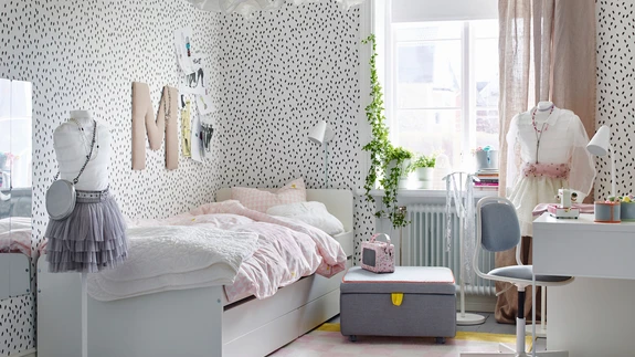 Kui tuba on algusest peale kujundatud paindlikult, pole tarvis kogu sisustust ümber vahetada. Pidage noore toaelanikuga nõu, millised asjad asendada, mida juurde lisada või ära võtta. Teismelise tuba kujundama asudes on oluline noore inimesega läbi arutada, millist stiili ta eelistab ning millisteks tegevusteks ta ruumi kõige sagedamini kasutab. Kuueteistaastase Kaisa toa uuenduskuur sai teoks ruumi viimistlust muutmata. Toa seinad jäid valgeks, nagu need varemgi olid, ühte seina jäeti Hanna Werningi suuremustriline tapeet. Ehkki tapeedimoes on vahepeal tõusnud esile graafilised õhulise mustriga seinakatted, otsustati olemasolevat tapeeti mitte välja vahetada – toa ülejäänud neutraalsel foonil ei mõju ekpressiivne seinakate pealetükkivalt.