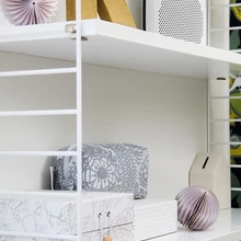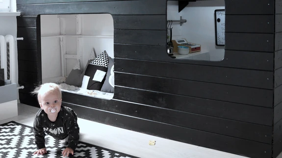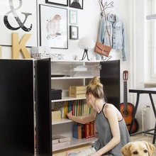 Suure lahtise riiuli asemele valiti madalam kapp, mille kohale soovis neiu sättida plakatid ja fotod. Kapp pärineb Soome tootjalt Lundia, puidust karkass osteti taaskasutatuna ja viimistleti heledaks. Kaisa eelistuseks olnud mustad kapiuksed telliti Lundiast uutena. Kapi peal on hea eksponeerida iluasju, ülejäänud pudi-padi saab kiirelt kapiuste taha peitu pista. Toa ja laua koristamine käib nüüd märksa kiiremini kui varem toas olnud lahtise riiuli puhul. Kaisale meeldivad tekstiilist kotid, kuid need kippusid alailma põrandal vedelema ja tolmu koguma. Nüüd sätiti seinale puukujuline Maze nagi, mille oksade külge saab riputada nii riidest kotte kui ka rõivaid.