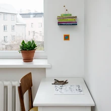 Magamistoas olev kasest puupakk, mis täidab edukalt öökapi ülesannet, on peremehe enda saetud. Otstarbekalt põrandaruumi kokku hoidvad raamaturiiulid elutoa lae all on samuti pererahva valmistatud. Elutoa diivanialaua alge on vana polüesterlaud, mille raam puhastati roostest ja värviti valgeks, loodusliku servaga tammest pealislauad toodi välja Britta maakodu puukuurist. Kasutuse on leidnud ka eelmiste omanike poolt korterisse jäetud söögilaud, mis väiksemaks konstrueerituna sobis väga hästi lastetoa lauaks.