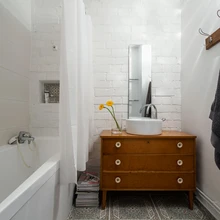 Ruumid tõsteti eelmiste elanike jäetud mööblist tühjaks ning aja jooksul üksteise peale kogunenud seinakattematerjale hakati kiht-kihilt eemaldama, et paljastada võimalikult palju maja enda pakutavat naturaalsust ja ehedust. Selle töö käigus koorus välja suureks positiivseks üllatuseks äge tellissein, mis läbi korteri mööda ühte külgseina jookseb. Ajastu hõngu lisab ka tellistesse sisse pressitud valmimisaasta 1989. «Kui olime tellised avastanud, tekkis kõigepealt mõte, et toome need nähtavale köögi töötasapinnataguses seinas. Seejärel mõtlesime, et paljastaks ajastu töökultuurile omase vildaka ladumisstiiliga telliste robustse ilu krohvi alt ka vannitoas. Edasi otsustasime tellistega lõpuni minna, ehk ka suure seina magamistoas krohvi alt välja toksida, mis sai omakorda kohe naturaalse halli savivärviga üle tõmmatud, et magamistuppa natuke rohkem pehmust ja soojust tekiks.»