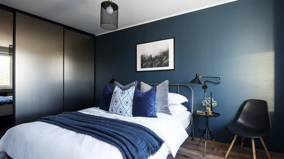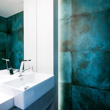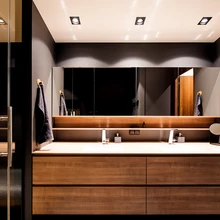 Tume, summutatud tonaalsus jätkub kõikides ruumides. Sisekujundaja sõnul tuleb tunnustada tellijat, kellel oli julgust otsustada musta vannitoa kasuks. «Musta puhul kardetakse, et see mõjub pimedalt ja süngelt, kuid tegelikult teevad tumedad toonid ruumi hubaseks,» lisab ta.