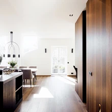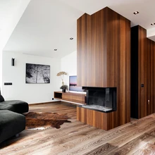Kujunduse siduv element on tume puit – elavamustrilist spooni on kasutatud sisseehitatud mööblil, ustel ja seinapaneelidel. Kõrgete spoonpaneelidega kaetud sein kulgeb esikust elutuppa, moodustades avaras ja helges ruumis konkreetse arhitektuurse mahu. «Valisime seintele väärika suitsutatud tammespooni. Kui tavaline peitsitud spoon mõjub sageli plassilt, siis termotöötlus toob välja puidu kauni mustri ja värvierinevused. Need hakkavad suurel pinnal vahvalt elama ja mängima,» selgitab Mari. «Peale selle sobis tumepruun toon täpselt kokku pere lemmiku, Jack Russelli terjeriga, kes kogu projekti jooksul pererahvaga igal pool kaasas käis ning oli igati tähtis tegelane.»