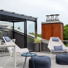 Avara elutoa, magamistoa ja kabinetiga elamispind laieneb katuseterrassile, mis kujundati samuti mugava, stiilse ning funktsionaalse lisaruumina. 50 m2 suurusel terrassil on mõnus päikeseline leboala, jahedamatel päevadel pakub tuulevarju klaasitud pergola ning visuaalset eraldatust loovad terrassikastides tuule käes õõtsuvad sihvakad kõrrelised. Vaated rohelusse, vanalinnale ning üle tänava asuvale juugendelamule on kahtlemata lummavad ja ruumilist mitmekesisust lembivad. Moodne linlik olemus ja tume-sumedatest toonidest ning tekstuuridest sündinud mitmekihilisus iseloomustab ka valminud korterikujundust.