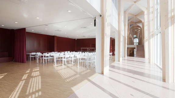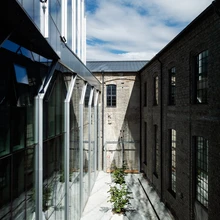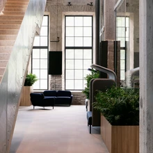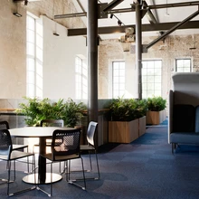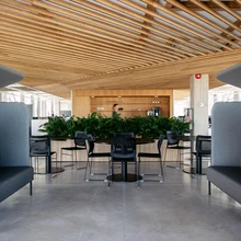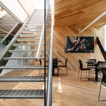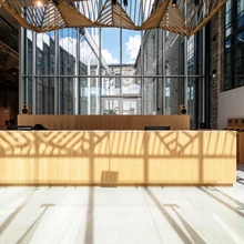 Kõrge laega fuajees, aga ka mujal, hakkavad silma puidust elemendid (iseäranis torustikku ja juhtmeid varjavad ripplaed), mida on toodud sisse betooni, metalli ja klaasi jaheduse kodustamiseks. Ühtlasi on ju puit aus ajalooline materjal, mis haakub kunagise tööstusala esteetika, aga ka tegevusalaga (mis see tooraine ikka oli kui mitte puit!).