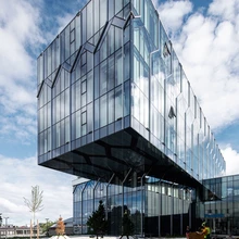 Sisenedes hakkab silma kohe parklakorrus, mida piiravad lihtsalt võrratud uduvihma meenutavad klaaslamellid. Peasissepääsu kohal eendub konsoolina neli ülemist korrust, mis päädivad katuseterrassiga. Omamoodi ehitusaineseks paistavad olevat pilved, mis mööda seinapindu tuulte tahtmisi mööda seilavad. Hoone ees on kargelt kivine – osaliselt klaasist, osaliselt sepispiirdega – lõunasse avanev väljak, mida meedia kasutab sarnaselt terassidega usinalt televõtete tegemiseks, ning mille meeleolu jätkab sisehoov. «Kui sa tuled siia, näed mitmekesist ümbrust ja tekib ajastute kihiline ruum,» iseloomustab Aule eritabast olustikku.