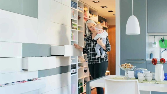Perepoja magamistoas napsati osa pinnast garderoobi tarvis ja tuppa jäi alles täpselt paras nišš suurele voodile, mille all on omakorda panipaigad. Lisamagamiskohtadeks on korteris garderoobi peale kavandatud lavats, kuhu pääseb puidust redelit pidi, ning elutoa suur mooduldiivan (tootja Borg).