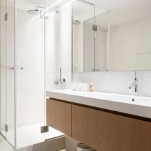 Oluliselt mastaapsemaks ettevõtmiseks kujunes mahagonist parketi asendamine valge keraamilise plaadiga. Gicageri suuremõõtmeline plaat Light Surface läbib kogu kujundust ja loob igal sammul avarustunnet. Magamistoas tõuseb viie erineva pinnatekstuuriga plaat ka seinale ja lisab helgesse ruumi toreda monokroomse mustrinüansi.