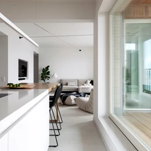Kui Noblessneri sadamalinnaku uute majade vahel lõõskab hilistalvel kõle meretuul, siis ülemisel korrusel asuv korter on seevastu tõeline rahuoaas. Karge meri jääb turvaliselt suurte akende taha ning malbet rahu ja vaikust rõhutab omakorda üleni valgetes toonides sisekujundus.