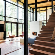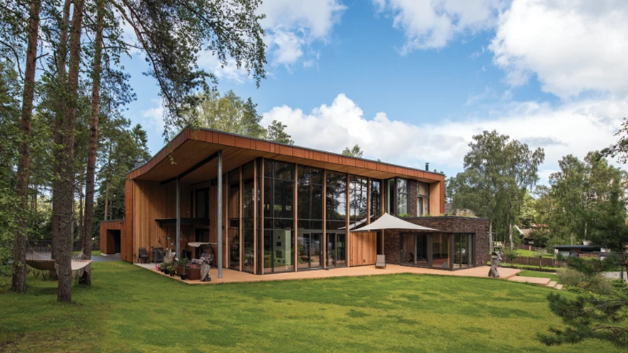 «Nii suure liimpuidust karkassile toetuva klaasfassaadi projekteerimine oli väljakutse,» nendib arhitekt. «Mitmel korral kaalusin liimpuitkarkasside vahetamist tavalise alumiiniumfassaadi vastu, aga siiski leidsime lahenduse ja projekteerisime lõpuni. Ehitaja, Edictum Ehitus OÜ, oli väga tubli ja sai kõigega hästi hakkama.» Kuigi selles mitmesajaruutmeetrilises majas on esindatud kõik tuntumad konstruktsioonitüübid, on arhitekti hinnangul maja hing soe ja puidune ning tema arvates on see puitmaja.