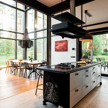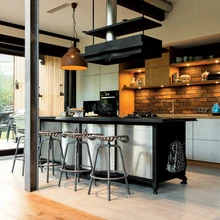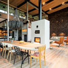 «See rahvusromantiline tulekolle kannab endas eestlaslikku ahjutraditsiooni,» nendib sisearhitekt Hannelore Kääramees. Söögitoa otsas paikneb köök. Köögilahendus nagu ka kogu maja sisekujundus on sündinud Marge Tammise ja Hannelore Kääramehe aktiivses koostöös. «Kõik sai alguse köögisaarepildist, mida ma aastaid endaga kaasas kandsin,» mainib majaperenaine. «Sain aru küll, et seda on väga raske teostada, aga viimaks leidsime firma Aruut, kus minu soov täideti.» Ülejäänud köögimööbli kavandas sisearhitekt ja algul tundus see Margele liiga lihtsana, aga siis leidis Hanneloore firma Slate Floor eheda betooniga viimistletud ukseplaadid, mis sobivad ka köögi tellisseinaga. «Mulle meeldivad vanad tellisseinad, nii et elutuppa ja kööki valisime kulunud moega tellise Wienerbergenist. Tahtsin sellist sügavat hambulist vuuki, mida pole pinnal näha,» selgitab perenaine.
