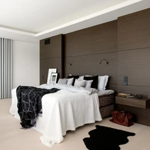Sinna viiv klaasist piirdega trepp on väga stiilne. Tumedad spoonpaneelseinad jätkuvad teisel korrusel, põrandad on saarepuidust. Ruumikas magamistoas võib lõõgastuda tugitoolis raamatut lugedes, muusikat kuulates või lihtsalt aknast kaunilt kujundatud aeda vaadates. Selles interjööris jätkavad sisearhitektid nii voogava ruumi kui ka puitpaneelidega kujundusprintsiipi: voodi otsaseina taha on abikaasadele kavandatud avatud garderoobid: üks pool on mehe, teine naise päralt. Sealt pääsevad mõlemad salongilikku pesuruumi, mille aknaid katavad, nagu mujal majaski maast laeni kardinad. Klaasist dušikabiini ja sisearhitektide kavandatud valamulauaga ruumi on valitud ka stiilne sanitaartehnika.