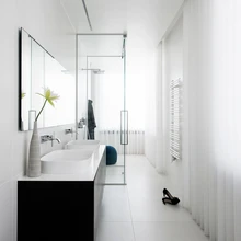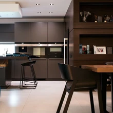 Iga interjööri muudab eriliseks rätsepatööna tehtud mööbel. Sisearhitektid projekteerisid muu sisustusega samas laadis tumeda mustast graniidist tööpinnaga köögimööbli. Algul kaaluti ka valget värvi kööki, aga kuna lagi, seinad ja põrand on samuti valged, õnnestus neil klienti veenda tumeda variandi kasuks otsustamisel.