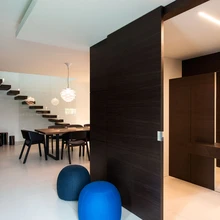 Täismassplaadid ja valge krohv korduvad ka siseruumide viimistluses. «Mõistagi inspireerib meid siselahenduste loomisel maja arhitektuur, aga iga kodu tuleb ikkagi pererahva nägu,» mainib Tuuli Trei. «Tahame luua interjööri näol fooni, näiteks selles eramus tumeda/heleda seina, mis jääb aastateks taustaks mööblile, aksessuaaridele jms,» selgitab Margit Teikari. Hiljem on lihtne näiteks pehmet mööblit ja tekstiile vahetades ruumi ilmet muuta. Sisearhitektide kavandatud kujundus näib küll esmapilgul lihtne, aga teostus oli parasjagu keeruline. Majaperemees pakkus ka ise otstarbekaid tehnilisi lahendusi. «Meil toimusid väga sisutihedad arutelud, kus vaagisime koos keerulisemad «sõlmed» üksipulgi läbi,» nendib Trei.