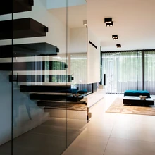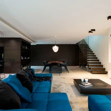 Maja alumisel korrusel paiknevad kabinet ja voogava ruumina lahendatud avar elutuba koos avatud köögiga. Siit pääseb spaakompleksi, koduhoiuruumi ja garaaži. Skulpturaalne, maast laeni klaaspiirdega konsooltrepp viib teisele korrusele, mis on tsoneeritud kaheks: üks pool on vanemate, teine tütre päralt. Modernistliku joonega villat läbib tumedate puitseinte ning valgete värvitud ja heledate klaas- ning kivi-pindade kontrast. Alumise korruse põrand on suuremõõtmelistest täismassplaatidest. Sellisele materjalivalikule aitas kaasa ka pere lemmik, samojeedi koer Lumi, kes armastab tohutult koduste seltskonnas viibida.