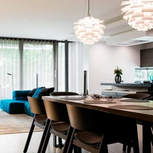 Valdavalt on valgustid tagasihoidlikud, kuid ruumi aktsent on efektne rippvalgusti söögilaua kohal ja põrandavalgustid. Üldiselt on rõhku pandud pigem heale valgusele ja valgustusele. Majas on gaasikamin. Sisearhitektide sõnul eelistatakse neid aina rohkem, sest gaasikamina elav tuli on sama lummav, aga hooldamine lihtsam.
