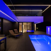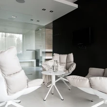 Veel mõnusamaks olemiseks on spaas ka mugavad tugitoolid Husk. «Meie põhimõte on valida interjööridesse vähe asju, aga väga kvaliteetseid,» ütleb Teikari. «Kui rääkida santehnikast, siis efektsed on Jaapani tootja Toto valgusega valamu külaliste WCs ja spaas valgusega dušš,» loetleb Trei. Villa terrassid on varustatud õueeluks sobiva mööbliga: lamamistoolid basseini ääres, söögilaud ja istmed grillide kõrval. Nüüd hakkab maja oma elu elama, on sisearhitektid kujunenud tervikuga rahul: «Seda projekti tehes arenesime ise ja loodetavasti avardasime ka pererahva silmaringi!»