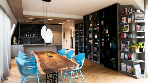 Hiljuti valminud omanäolise arhitektuuriga elamu kogu katusekorrust hõlmavasse korterisse on loodud voolava ruumi, kunstiteoste, raamatute ja toataimedega mõnus kodu....